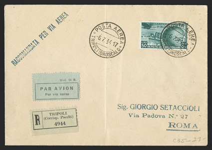 postmark to Rome with arrival backstamp, the second also a register#C29-35, 1934 50c-50L 2nd World soccer championship, two covers, one a registered air mail cover franked by the 50L value and tied by clear "Posta Aerea/Tripoli Idroscalo/6.7.34" postmark to Rome with arrival backstamp, the second also a registered air mail cover with 50c-25L (the other six values from the set), plus the 5L Brown regular issue (#49), all tied by six strikes of "Posta Aeria/Tripoli Idroscalo/19.6.34" postmarks to Rome with arrival backstamps, former with a harmless vertical pocket fold, fresh and very fine; Scott catalogs the complete set on one cover for $1,800.00 (imagea) (Image) Est. $500-750