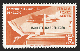 Vienna, Austria by Coo, Egeo2.10.34 postmarks, Coo registry etiqu#C28-31, 1934 2nd World soccer championship complete set tied along with two Rhodes 1.25L Dark blue (#21) on front and 25c Green (#18) on reverse of registered air mail cover to Vienna, Austria by "Coo, Egeo/2.10.34" postmarks, Coo registry etiquette, eight transit and arrival backstamps, cover with a harmless vertical pocket fold at center, very fine and scarce. (Image) $1,250.00