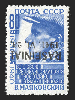 250 inverted overprints were issued of the three types combinedTelsiai Michel #10 I K, 1941 20k Red Army overprinted "Laisvi/Telsaia/1941.VI.26" Ty. I, inverted overprint, pos. 35, well centered and fresh, o.g., n.h., very fine and scarce; only 250 inverted overprints were issued of the three types combined; 1995 Krischke certificate. (Image) Michel €1,100