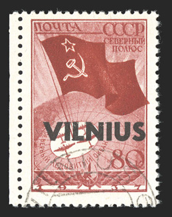 only 160 examples were printed signed E Keiler and accompanied byWilna Michel #17 V, 1941 80k Carmine overprinted "Vilnius", notch top right in right hand upstroke of "N", pos. 11, left sheet-margin used example, neat Vilnius c.d.s., very fine; only 160 examples were printed; signed E Keiler and accompanied by 1995 Krischke certificate. (Image) Michel €500