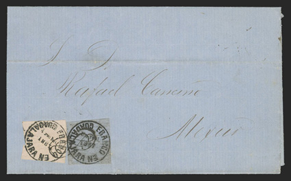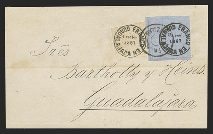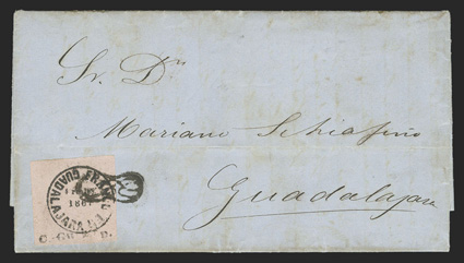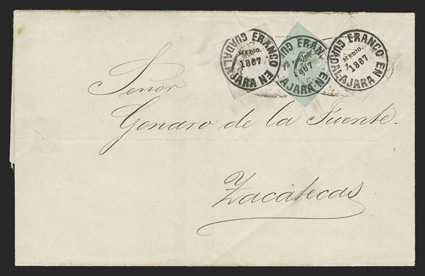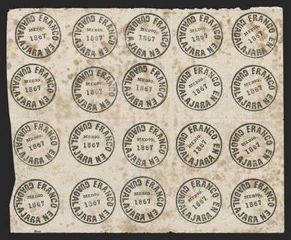 comprised of 89 covers and 55 off-cover items, including mint singles, with aMexico - A highly important collection of Guadalajara Civil War provisional issues, a truly amazing exhibition collection of this notoriously difficult philatelic area comprised of 89 covers and 55 off-cover items, including mint singles, with a surprising number of multiples, used singles, many of which are on piece, sometimes with other values, rare serrated perforations, and ending with the best collection of forgeries ever assembled containing much new original research, all eruditely written up and mounted on exhibition pages.The war between the Liberals headed by Juarez and the Conservatives headed by the Emperor Maximilian divided the country in two. In November, 1866 the Emperor lost control of the Guadalajara region to the Juarez Republicans. In January, 1867 the Guadalajara district postmaster issued his own provisional stamps, since the Maximilian stamps could no longer be used. His region was surrounded by enemies, so he had to make the stamps rudimentarily using a circular cancellation device as the basic design. There was also a scarcity of paper in the city so the postmaster had to buy whatever paper colors and types that he could find. The result was the production of at least 60 different identifiable stamp types in five denominations, often in very small quantities. This local issue was used until the war ended and the Federal government issued new stamps in September, 1868, although covers exist showing usages up to the month of October.The classic Mexico local Provisional issues are comprised of those issued by Chipas, Cuernavaca, Campeche, Chihuahua and Guadalajara and are among the most mysterious and sought-after fields of philately. That is because of their extreme rarity and their primitive design and beauty. Among these provisionals, those of Guadalajara are the only ones with enough different stamp types and covers to build a significant exhibit. While they issued more than 60 different stamps and perhaps as many as 500 covers have survived, all the other Mexican Provisionals only have a handful of stamps and a mere 10-20 covers extant. Of the approximately 500 covers that are believed to exist, only a few exist of most stamps and some stamps are not known to exist on cover.So, how do you end up with more than 60 different types of stamps when making then from a simple canceling device? By a combination of 1) Five denominations - Medio Real, Un Real, Dos Reales, 4 Reales and 1 Peso. 2) Four distinct periods as distinguished by small design changes in the typography of the device used to print the stamps. 3) Eight colors of paper - white, rose, lilac, blue-grey, dark blue, green and dark green. 4) Five types of paper - wove, quadrille, batonne, oblong quadrille and laid. 5) Imperforate and serrated stamps, the latter thanks to a brief experiment which lasted a few weeks and only in Guadalajara City. 6) An overprint used for a few weeks in the small Ciudad Guzman town. 7) A handful of 2 and 4 Reales bisects, and. 8) The printing errors "nu" for "un" and "1863" for "1868."Some selected highlights from the collection include the earliest known usage, a cover franked by 2r Dark green (#5), with oval January 11, 1867 cancel, a mint block of twenty of the ½r on white wove paper (#1), this being the largest known multiple and arguably the most important item of the issue, a 3r combination cover franked by two ½r White (#1) and one 2r Dark green (#5), this being the only recorded combination with a 2r stamp, a cover franked by 1r White (#4) and 2r White (#6), which is the only such combination recorded as well as being the earliest known usage of the 1r stamp, a cover with 1r Dark blue (#3) and 2r Dark green (#5), this being not only the earliest recorded usage of the 4r, but also one of only four recorded examples on cover and the only such combination known, cover front franked by 2r Green (#15) and half of 2r Rose (#18 var.) tied by Guzman cancel, this being the only known 2r Rose bisect and combination, cover with 4r Rose (#7) tied by oval March 29, 1867 datestamp, which is the earliest recorded usage and one of only about 10 covers franked by this stamp, cover franked by 4r Rose (#7) forwarded by agent G.C. Sattler in Colima to his offices in Guadalajara where it entered the mails to Zamora, this being one of only three or four forwarded covers and the only one known with a 4r stamp, a cover franked by a combination of 4r Rose (#7) and 1r Blue on thin oblong quadrille paper (#35), which is in all likelyhood a unique combination, a 5r rate combination cover franked by 4r White (#8) and 1r Blue on oblong quadrilled paper (#35), a rare bisect cover paid by half 4r Rose (#7a) tied by Guzman cancel, of which only 10-12 are thought to exist, cover franked by 4r Rose with "C.-Guzman" overprint (#7b), of which only 3-4 are believed to exist, a cover with one of two recorded examples of 2r Green with double serrate perforations (#14 var.), cover from Zapotlan to Tapalpa with 1r Green on laid batonne paper with "1863" of "1868" error (#42 var.), plus there is an "L" shaped mint block of three showing the error, which is the largest recorded multiple, and lastly, there is a cover franked by a vertical pair of 1r Green on laid paper, both showing the "nu" for "un" error (#47b), this being one of only three recorded covers.This collection contains a very significant number of the 60 different stamp types as well a many rare or uncommon covers. It was formed during a span of twenty years from the amalgamation of several important collections, including those formed by Bash, Dr. Scott and Quintus Fernando and Omar Rodriguez. This collection has won two International Gold Medals, two Reserve Grand Awards and several Gold Medals in the United States and Mexico. It includes many rarities which have not changed hands in a decade or more. Most items have MEPSI certificates, a total of 116 of which accompany