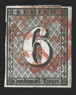 bright red rosette cancel faint horizontal crease, otherwise very fine 1#1L4, 1846 6r Black Zurich cantonal, horizontal red lines, Type I, position 96, four full margins, especially deep and intense color, razor-sharp impression on fresh paper, bright red rosette cancel faint horizontal crease, otherwise very fine; 1997 Renggli certificate (Zumstein #2W; SF2,150). (Image) $1,600.00