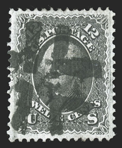 impression, fairly light circle of wedges cancel, extremely fine a pa#85E, 12c Black, "Z" grill, a highly desirable used example of this scarce grilled stamp, being uncommon well centered within exceedingly large margins, deep intense color and impression, fairly light circle of wedges cancel, extremely fine; a particularly well centered and margined copy of this elusive and difficult stamp; 1989 PF certificate. (Image) $2,500.00