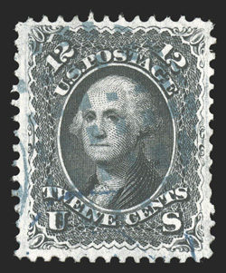 unusual fancy blue grid of dots postmark, extremely fine 2008 PF#97, 12c Black, "F" grill, an eye-catching used example, with deep prooflike color and impression on crisp white paper, exceptionally well centered, beautifully cancelled by an unusual fancy blue grid of dots postmark, extremely fine; 2008 PF certificate. (Image) $335.00
