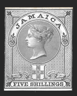surrounded by hand-drawn pen and ink frames, below which are manuscript1879 3d and 1/- Telegraph stamp essays, manuscript Requisition sheet (202x320mm) upon which are affixed essays for the 3d and 1/- designs, each made with printed head in blue surrounded by hand-drawn pen and ink frames, below which are manuscript specifications for design, size, color and value, along with the note To be put up in square blocks of twenty Shillings in value, as English Postage Stamps are." and dated 3rd March 1879 at the GPO Jamaica, 1/- light stain, otherwise very fine and unique; ex-De La Rue Archives. (Image) Est. $1,000-1,500