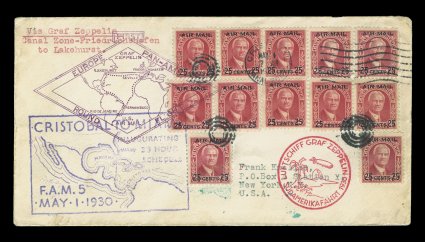 321 c Sieger #64II imageSieger #64II, 1930 Pan-American Flight, twelve 25c on 2c Carmine air posts (one with perf. faults) tied to combination First Flight/Zeppelin Flight cover by targets and "Cristobal/Canal Zone/May 1, 1930" machine cancel, first flown on Cristobal to Miami first flight of F.A.M. 5, then by ship to Friedrichshafen for the Zeppelin flight from there to Lakehurst, red German and violet American flight cachets, backstamped Lakehurst, slight cover soiling, otherwise very fine; a rare special posting for the Pan-American Flight with only fifteen covers recorded; signed Arthur Falk (Sieger €3,000; Michel #68G). (Image) Est. 1,000-1,500