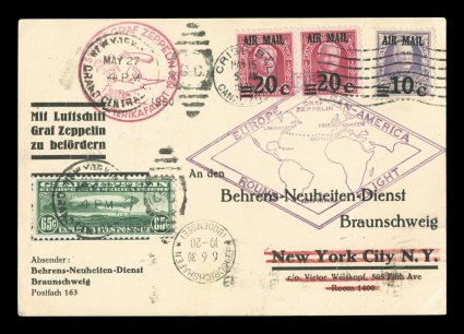 322 c Sieger #64III imageSieger #64III, 1930 Pan-American Flight, mixed franking card with three Canal Zone air posts tied by "Cristobal/Canal Zone/May 15, 1930" machine cancel, flown via Cuba with Havana transit to Lakehurst for the return flight of the Zeppelin from Lakehurst to Friedrichshafen with well centered U.S. 65c Zeppelin tied by "New York, N.Y./Grand Central Sta./May 27, 1930" duplex, red German and violet American return flight cachets, backstamped Friedrichshafen, trivial corner crease, a clean and attractive card, very fine; only 25 cards flown (Sieger €1,600; Michel #68Gb). (Image) Est. 1,000-1,500