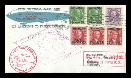 323 c Sieger #64III imageSieger #64III, 1930 Pan-American Flight, lovely mixed franking cover with four Canal Zone adhesives, including three air posts, tied by "Cristobal/Canal Zone/May 22, 1930" machine cancel, to Lakehurst for the return flight of the Zeppelin from Lakehurst to Friedrichshafen with nice U.S. $1.30 Zeppelin tied by "New York, N.Y./Varick St. Sta./May 29, 1930" duplex, red German and violet American return flight cachets, backstamped Friedrichshafen, in addition signed by Dr. Eckener, trivial corner crease to cover of no consequence, very fine; only 20 covers flown (Sieger €1,600; Michel #68Gb). (Image) Est. 1,000-1,500