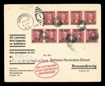 325 c Sieger #64IIIb imageSieger #64IIIb, 1930 Pan-American Flight, nine air posts in strips of four and five tied to neat cover by targets and "Cristobal/C. Z./May 15, 1930" duplex, by air from Cristobal to Havana, Cuba where it was intended to board the Zeppelin, but since the Zeppelin did not stop as planned in Havana it was taken by ship to Seville, Spain where it boarded the Zeppelin for the last leg from Seville to Friedrichshafen, oval Zeppelin cachet, Havana and Seville transits, backstamped Friedrichshafen, fresh and clean, a very fine and rare Canal Zone posting with only a few covers recorded (Sieger €1,600; Michel #68G var.). (Image) Est. 1,000-1,500