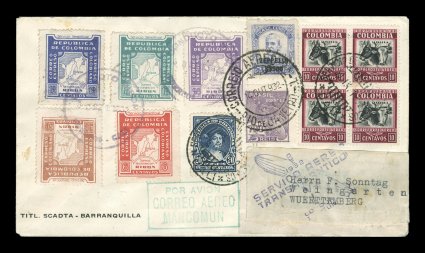 328 c Sieger #190C var. imageSieger #190C var., 1932 Eighth South America Flight, triple mixed franking cover originating in Colombia with a single and block of four tied by Cali c.d.s., plus five Ribon Express stamps for the internal transmission to Barranquilla, then to Brazil with two adhesives, including the 3,500r Zeppelin overprint, tied by "Correio Aereo/Rio de Janeiro/14 Out. 932" c.d.s. for the return flight to Germany, violet flight cachet, backstamped with Friedrichshafen machine cancel, very fine (Sieger €400+; Michel #285Ae). (Image) Est. 200-300