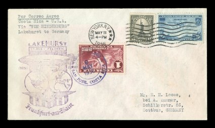 329 c Sieger #409L imageSieger #409L, 1936 First North America Flight of the "Hindenburg", attractive mixed franking cover for the return flight with a Costa Rican 1Col Deep rose air post tied by "Correo Aereo/San Jose, Costa Rica/9 May 1936" double-ring c.d.s., plus two United States adhesives tied by New York machine cancel, violet United States flight cachet, backstamped Frankfurt with Zeppelin machine cancel, very fine and quite scarce (Sieger #€1,200; Michel #13). (Image) Est. 500-750