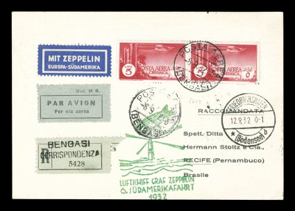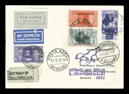 331 c Sieger #171Aa imageSieger #171Aa, 1932 Fifth South America Flight, registered card 50c Cyrenaica air post and six adhesives of the Italian Colonies issues on front and back, all tied by "Posta Aerea/(Bengasi)/23. 8. 32" c.d.s., Friedrichshafen transit c.d.s., well struck violet flight cachet, backstamped Pernambuco, very fine; a scarce posting from the Italian colonies, this being the first listed by Sieger for Cyrenaica (Sieger €750; Michel #273a). (Image) Est. 300-400