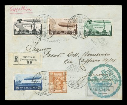 334 c Sieger #212G imageSieger #212G, 1933 Italian Flight, rare registered full Zeppelin set cover with all six values plus two other adhesives tied by "Bengasi/Posta Aerea-Zeppelin/25 5 33" c.d.s., flown on the flight around Rome, violet Italian flight cachet, backstamped with the Rome machine cancel, unobtrusive vertical fold not affecting the stamps or markings, very fine; an exceptionally rare cover with the complete Zeppelin set and only a few made; signed A. D(iena), Bolaffi (Sieger €2,000; Michel #303Ea). (Image) Est. 1,000-1,500