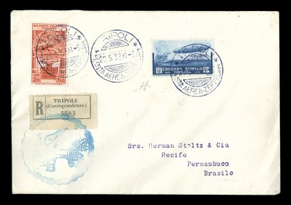 340 c Sieger #299Aa imageSieger #299Aa, 1935 Fourth South America Flight, unlisted Zeppelin flight cover with three values of the 1934 air post semi-postal set tied by "Posta Aerea/(Bengasi)/1. 5. 35" c.d.s., connecting with the Zeppelin through Friedrichshafen via Rome with red general Zeppelin flight cachet with index letter "b" for the Friedrichshafen connection, backstamped Pernambuco, very fine; a late period Zeppelin flight that is listed by neither Sieger nor Michel (Michel #442a). (Image) Est. 400-500