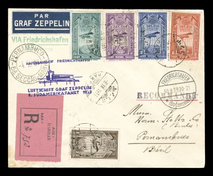 381 c Sieger #235Aa imageSieger #235Aa, 1933 Eighth South America Flight, attractively franked registered cover with five different Ethiopian air posts tied by "Harrar/6. IX. 1933" bilingual c.d.s., violet flight cachet, routed through Friedrichshafen with transit c.d.s., Pernambuco receiving c.d.s. on the front, very fine and choice; an extremely rare Zeppelin cover from this African country possessing great eye appeal (Sieger €1,000; Michel #343a). (Image) Est. 1,000-1,500