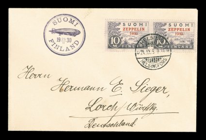 386 c Sieger #89B imageSieger #89B, Baltic Sea Flight, a handsome horizontal pair of the specially prepared 10M "Zeppelin/1930" overprint for this flight, tied to particularly clean cover by "Helsinki/Helsinfors/24. IX. 30" bilingual c.d.s., well struck violet flight cachet, backstamped Friedrichshafen, extremely fine (Sieger €675; Michel #128Ad). (Image) Est. 200-300