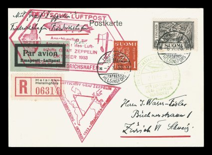 390 c Sieger #238E imageSieger #238E, 1933 Chicago Flight, an unusually rare posting for Finland (or any treaty-state posting) doing the entire round trip from Friedrichshafen to Friedrichshafen, two adhesives tied to fresh card by "Helsinki/Helsingfors/6. X. 33." bilingual c.d.s., red German flight cachet and Berlin connecting flight cachet, green Friedrichshafen Zeppelin receiving c.d.s., very fine; ex-Kofler (Sieger €500+; Michel #355b). (Image) Est. 500-750