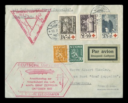 391 c Sieger #238E imageSieger #238E, 1933 Chicago Flight, attractively franked cover with five adhesives, including the 1933 semi-postal set cplt., all tied by "Viipuri/10. X. 33" c.d.s., red German flight cachet, plus Berlin connecting flight cachet on front and back, backstamped Pernambuco, very fine; ex-Belinkoff (Sieger €500; Michel #347b). (Image) Est. 300-400