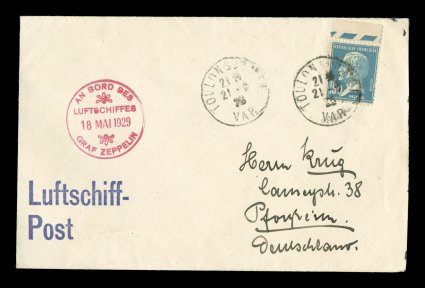 393 c Sieger #026I imageSieger #026I, 1929 Return from Curs of the interrupted America Flight, petite cover with four adhesives of France tied by "Cuers/var/22 -5 29" c.d.s., red on-board cachet of May 22rd and Friedrichshafen receiving c.d.s. of May 24th on front and back, also bearing three signatures of the crew including Dr. Eckener and Ernst A. Lehmann, very fine and choice;ex-Sieger (Sieger €450; Michel #24c). (Image) Est. 200-300