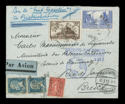 396 c Sieger #138Aa imageSieger #138Aa, 1932 First South America Flight, five adhesives tied to cover by "Paris/Rue Taitbout/ 19. III. 32" c.d.s., Friedrichshafen transit c.d.s., violet flight cachet, backstamped Rio de Janeiro, very fine (Sieger €475; Michel #234a). (Image) Est. 200-300