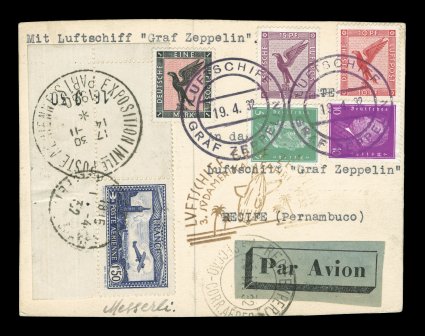 397 c Sieger #150Ab imageSieger #150Ab, 1932 Third South America Flight, unusual mixed franking with a corner margin single of a French 1.50Fr Dark blue air post with a large International Air Exposition handstamp of 1930 and indistinct c.d.s. of April 1, 1932, in mixed franking with five German adhesives tied by "Luftschiff/Graf Zeppelin/19. 4. 1932" on-board c.d.s., brown flight cachet, backstamped Pernambuco, very fine; (Sieger €275 for normal non-mixed franking; Michel #239c). (Image) Est. 200-300