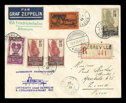 402 c Sieger #235Aa imageSieger #235Aa, 1933 Eighth South America Flight, attractively franked registered cover with six adhesives tied by "Libreville/Gabon/28 Aout 33" c.d.s., violet flight cachet, Friedrichshafen transit c.d.s., backstamped Lima, Peru, very fine; a choice cover from this small African country; Sieger only lists five flights on which covers from this country are known and all are rare (Sieger €1,000; Michel #343a). (Image) Est. 750-1,000