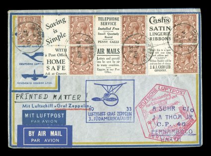 410 c Sieger #219B imageSieger #219B, 1933 Third South America Flight, printed cover for the Zeppelin flights with impressive franking of three different blocks of four from the 1924 advertising booklet panes, each block with two 1 1/2p Brown and two different advertising labels (eight different), all tied by "Guernsey/23 JU 33" c.d.s., violet flight cachet and Berlin connecting flight cachet, backstamped Pernambuco, very fine; a very unusual franking and rare as seldom are these advertising labels found used on covers, let alone on a Zeppelin cover (Sieger €200 for the flight; Michel #315b). (Image) Est. 400-500