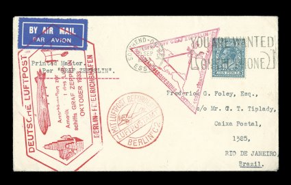 411 c Sieger #238E imageSieger #238E, 1933 Chicago Flight, neat cover with 10p Dull blue tied by "Southend-on-Sea/Essex/29 Sep 1933" machine advertising pmk., red German flight cachet and Berlin connecting flight cachet, backstamped Rio de Janeiro, very fine; signed Roger Koerber (Sieger €650; Michel #347b). (Image) Est. 200-300
