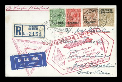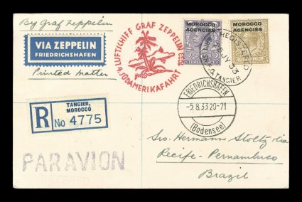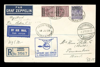 416 c Sieger #219Aa imageSieger #219Aa, 1933 Third South America Flight, fresh registered cover with three "Morocco Agencies" overprints tied by "Registered/British P. O. Tangier/13 JU 33" c.d.s., violet flight cachet, Friedrichshafen transit c.d.s., backstamped Pernambuco, very fine and attractive (Sieger €350; Michel #315a). (Image) Est. 150-200