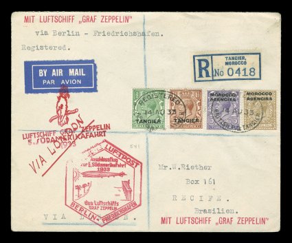 418 c Sieger #226B imageSieger #226B, 1933 Fifth South America Flight, two "Morocco/Agencies" and two "Tangier" overprints tied to registered cover by "Registered/British P. O. Tangier/14 AU 33." ovals, red flight cachet, connecting through Berlin with connecting flight cachet, backstamped Pernambuco, very fine (Sieger €300; Michel #327b). (Image) Est. 200-300