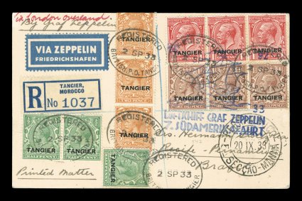 419 c Sieger #232B imageSieger #232B, 1933 Seventh South American Flight, attractively franked registered card with three strips of three, a pair and a single, all with "Tangier" overprints and tied by "Registered/British P.O. Tangier/2 SP 33" ovals, blue flight cachet on front and back and Berlin connecting flight cachet on the reverse, backstamped Pernambuco, very fine (Sieger €350; Michel #337b). (Image) Est. 200-300