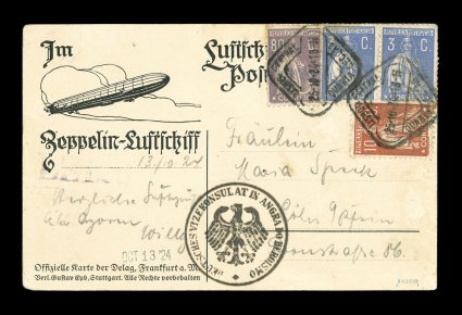 121 c Sieger #20c imageSieger #20c 1924 America Flight of the LZ 126/ZR 3, official drop at Angra in the Azores, DELAG card with view of Berlin, dropped at the Azores prior to starting the transatlantic passage, this rare posting, without flight cachets or Zeppelin cancels, is characterized by an official seal of the German Consulate in Angra plus a handstamped "Oct 13 '24" date, the card was then forwarded to the mainland by the steamer "Italos" where it received Portuguese franking tied by "Lisboa Central/25. 10. 24" postmarks, very fine and choice; one of the key pieces for the flights of this airship that eventually became the U.S.S. "Los Angeles"; signed H.W. Sieger (Sieger €2,150; Michel #7Id). (Image) Est. 1,000-1,500