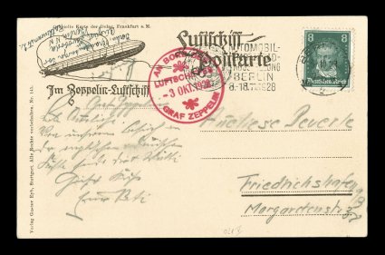 123 c Sieger #021IVh imageSieger #021IVh, 1928 Germany Flight, sepia-tone DELAG card with a view over Dresden, dropped at Berlin with 8pf Dark green tied by slogan machine cancel of "Berlin/ 3. 10. 28", strong strike of red on-board cachet of the same date, very fine (Sieger €600; Michel #5Ii). (Image) Est. 200-300