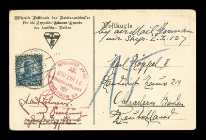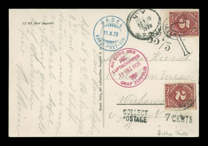 125 c Sieger #21c imageSieger #21c, 1928 America Flight, Zeppelin photo card with red on-board "Graf Zeppelin" cachet of October 11, 1928, dropped unfranked and marked postage due at Basel with blue "Basel/Kreis-Post-Dir/11. X. 28" c.d.s., being posted to the United States the postage due of 7c was collected there with U.S. 2c and 5c Carmine rose postage dues tied by Union City, N.J. ovals, message has a personal account of the start of the flight and now being over Basel, very fine and scarce; signed Arthur Falk (Sieger €900; Michel #7Ic). (Image) Est. 300-400