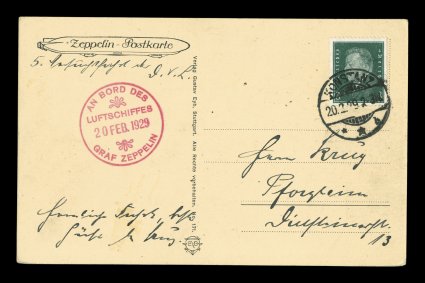 131 c Sieger #022VIIa imageSieger #022VIIa, 1929 Round Flight over Lake Constanz, Zeppelin card with an aerial view of Tubingen, 8pf Dark green tied by "Konstanz/20. 2. 29" c.d.s. where dropped, red on-board cachet of the same date, choice very fine (Sieger €400; Michel #15Ia). (Image) Est. 150-200