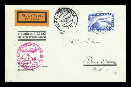 133 c Sieger #23ba imageSieger #23ba, 1929 Orient Flight, 2M Zeppelin stamp tied to neat cover by "Luftschiff/Graf Zeppelin/25. 3. 1929" on-board pmk., red lilac Ty. I flight cachet, dropped at Rome on the way to Palestine with "Roma-Ferrovia/25. 3. 29" c.d.s. receiving pmk. on the front, very fine and attractive; 600 covers are recorded dropped at this location; 1994 Sieger certificate (Sieger €650; Michel #18IIc). (Image) Est. 200-300