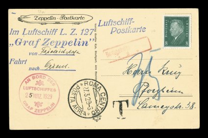 134 c Sieger #23bb imageSieger #23bb, 1929 Orient Flight, Zeppelin view card of an aerial view of Tubingen, 8pf Dark green uncancelled and charged 35(pf) postage due, red on-board cachet of March 26, 1929, changed in ms. to the 25th, dropped at Rome with "Roma Centro/27. 3. 29" c.d.s. receiving pmk. on the front, very fine; the scarcer of at least two drops over Rome (Sieger €1,000; Michel #18IIf). (Image) Est. 500-750
