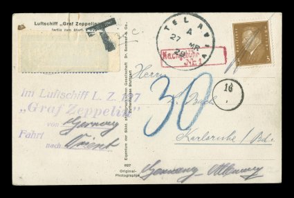 137 c Sieger #23f imageSieger #23f, 1929 Orient Flight, Zeppelin photo card dropped at Jerusalem without franking, addressed to Germany so charged 30(pf) postage due in blue crayon, backstamped with the proper Jerusalem repetitive slogan machine cancel of "27 Mar. 29.8PM" which confirms that this was in the small bag of mail dropped at Jerusalem, also most unusual on this drop is a red on-board cachet of the "Graf Zeppelin" dated 26 Mar. 1929 rather than the usual flight cachet for the Orient Flight, extremely fine; much of the mail that was backstamped Jerusalem on March 27th was actually dropped at the major Er Ramle drop and carried to Jerusalem the same day by rail, the few covers actually dropped at Jerusalem always have this 8 p.m. machine cancel; very rare and seldom offered (Sieger €1,150; Michel #18IIi). (Image) Est. 500-750