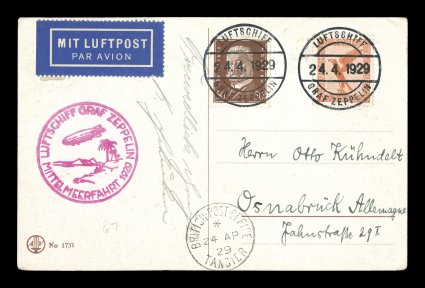 139 c Sieger #24b imageSieger #24b, 1929 Mediterranean Flight, Zeppelin view card with 1M Air Post tied by "Luftschiff/Graf Zeppelin/22. 4. 1929" on-board cancel, dropped at Tangier with Spanish receiving c.d.s. of April 26th, red flight cachet, all markings are well struck and on the address side, extremely fine (Sieger €500; Michel #20IIb). (Image) Est. 200-300