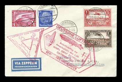 542 c Sieger #238E imageSieger #238E, 1933 Chicago Flight, mixed franking cover with three Luxembourg air posts tied by "Luxembourg/Ville/7. 10. 33." c.d.s., plus four German air posts tied by Berlin c.d.s., red German flight cachet on the front and Berlin connecting flight cachet on the reverse, backstamped Rio de Janeiro, very fine; there was actually a shuttle flight between Pernambuco and Rio de Janeiro, which both Sieger and Michel acknowledge, and this cover stayed on the Zeppelin for delivery in Rio de Janeiro on October 18th which makes this a different leg than the Pernambuco leg, though Michel does not list treaty-state postings to there (Sieger €500; Michel #348b). (Image) Est. 300-400