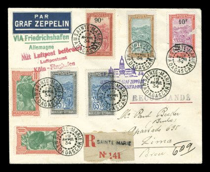 544 c Sieger #254Aa imageSieger #254Aa, 1934 Third South America Flight (Argentina Flight), a pretty registered cover with seven adhesives (small scuff to one) tied by "Saint-Marie/Madagascar/19 Avril 34" c.d.s., Friedrichshafen transit c.d.s., plus violet flight cachet on front and back, backstamped Lima, Peru, very fine; all Zeppelin covers of this country are extremely rare, with only five flights listed by Sieger, this popular flight of 1934 with pictorial cachet is the only one of that year and particularly desirable (Sieger €1,850; Michel #370a). (Image) Est. 1,000-1,500