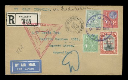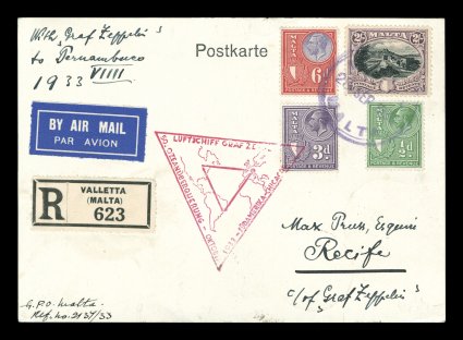 545 c Sieger #219Aa imageSieger #219Aa, 1933 Third South America Flight, neat registered cover with three stamps tied by "G. P. O./Malta/JU 26 33" c.d.s., violet flight cachet, Friedrichshafen transit c.d.s., backstamped Pernambuco, very fine; ex-Belinkoff (Sieger €600; Michel #315a var.). (Image) Est. 300-400