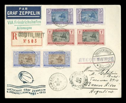 550 c Sieger #229A imageSieger #229Aa, 1933 Sixth South America Flight, very attractive registered cover with three horizontal pairs (small corner fault to one stamp) tied by "Boutilimit/Mauritanie/5 Aout 33" c.d.s., black flight cachet and Friedrichshafen transit c.d.s. via Dakar and Paris, backstamped Buenos Aires, Argentina, very fine; Mauritania is one of the rarest of the French colony countries for Zeppelin postings, this Sixth South America Flight is the first listing by Sieger for this country and the only flight of 1933; not listed in Michel; ex-Belinkoff (Sieger €750; Michel #333a). (Image) Est. 1,000-1,500