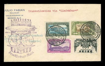 553 c Sieger #409T imageSieger #409T 1936 First North America Flight of the "Hindenburg", attractively franked cover for the return flight with four air posts of sole Mexican franking, tied by "Servicio Aereo/Mexico, D.F./6. May. 36." c.d.s., violet United States flight cachet, backstamped with Frankfurt Zeppelin machine cancel, cover slightly reduced at left, otherwise very fine; franking with only Mexican stamps was standard for this country unlike the many Latin American postings; signed Roger Koerber, Gappe (Sieger #€1,350; Michel #13). (Image) Est. 300-400