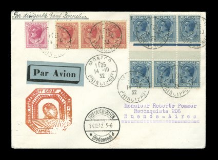 554 Sieger #195Aa imageSieger #195Aa, 1932 Ninth South America Flight, attractive franked cover with ten adhesives, including a gutter block of six, all tied by "Monaco/Principaute/14 -10 32" c.d.s., orange flight cachet, Friedrichshafen transit c.d.s., posted to Buenos Aires, Argentina with a portion of that city's backstamp, very fine (Sieger €550; Michel #286a). (Image) Est. 200-300