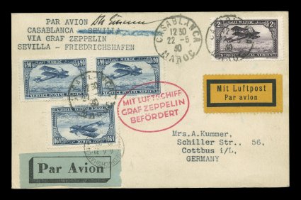 556 c Sieger #64XVb imageSieger #64XVb, 1930 Pan-American Flight, extremely rare card for the return flight from Seville to Friedrichshafen, four air posts all tied by "Casablanca/Moroc/22 -5 30" c.d.s., Seville transit of May 23rd where it boarded the Zeppelin in early June, red oval Zeppelin cachet, backstamped Friedrichshafen, signed Dr. Eckener, very fine; a total of only ten pieces were posted from Casablanca, this being one of five cards (Sieger €2,000; Michel #68Ad). (Image) Est. 3,000-4,000