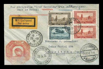 558 c Sieger #195Aa imageSieger #195Aa, 1932 Ninth South America Flight, four adhesives tied to cover by Casablanca-Bourse/Moroc/20 -10 32" c.d.s., orange flight cachet, Friedrichshafen transit c.d.s., backstamped Curitiba, Brazil on front and back, very fine and scarce early flight from this country; signed Arthur Falk (Sieger €750; Michel #286a). (Image) Est. 300-400