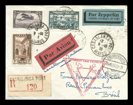 563 c Sieger #238Aaa imageSieger #238Aaa, 1933 Chicago Flight, attractive registered cover with three adhesives tied by "Casablanca-Port/Maroc/9 -10 33" c.d.s., Friedrichshafen transit c.d.s., red German flight cachet, backstamped Pernambuco, very fine (Sieger €500; Michel #347a). (Image) Est. 200-300