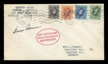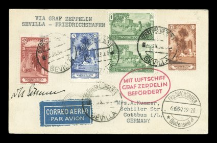 566 c Sieger #64XVIII imageSieger #64XVIII, 1930 Pan-American Flight, card from Tetuan, Spanish Morocco with five adhesives tied by "Correspa. Urgente/Seville/2 Jun 30" special delivery c.d.s., for the last leg of the flight from Seville to Friedrichshafen, red oval Zeppelin cachet, signed by Dr. Eckener, backstamped Friedrichshafen with two different postmarks, very fine; all mail from Tetuan did not have their stamps cancelled until they reached Seville, this is one of only 20 cards flown and most of the covers and cards were cancelled with the Seville hexagonal air post cancel, the special delivery cancel being quite the exception (Sieger €1,200; Michel #68Ad). (Image) Est. 500-750
