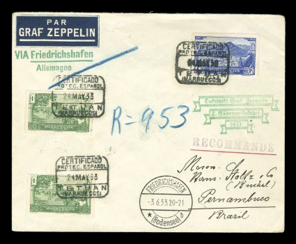 567 c Sieger #214Aa imageSieger #214Aa, 1933 Second South America Flight, registered cover with three singles tied by boxed "Certificado/Protec. Espanol/24. May 33/Tetuan/(Marrueco)" pmks., green flight cachet, Friedrichshafen transit c.d.s., backstamped Pernambuco, very fine and attractive (Sieger €550; Michel #305a). (Image) Est. 300-400
